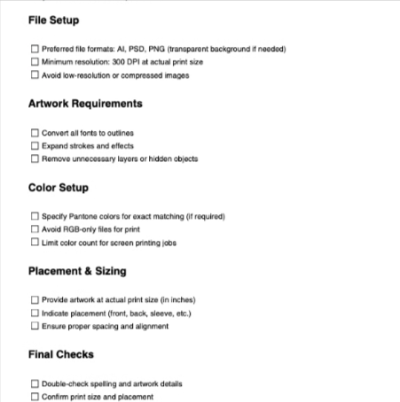 Tell us where on the garment you would like the specific design or logo and your account rep will create you a proper mock up to ensure that the design is printed as you intended.